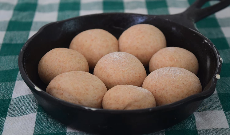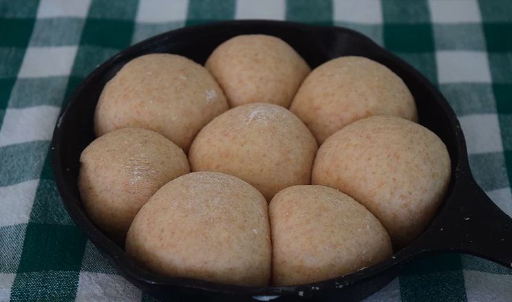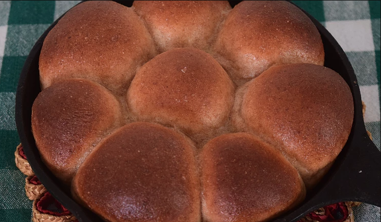 Place the rolls in a greased cast-iron pan, cover, and let proof for 50-60 minutes. During this proof, preheat your oven to 425F. Bake for 20-22 minutes, until the tops brown. Brush with melted butter after they finish baking.