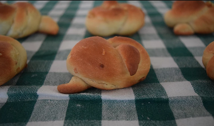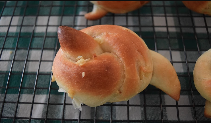 Follow the instructions above for the wheat rolls, folding the garlic into the dough after you’ve assembled it, until the divide and shape step. Divide your dough into pieces of about 40 grams in weight. To make a snake, take a piece of dough and roll it out into a long tapered tube. Knot with a simple over-under knot and place on parchment paper to rise for 50-60 minutes.